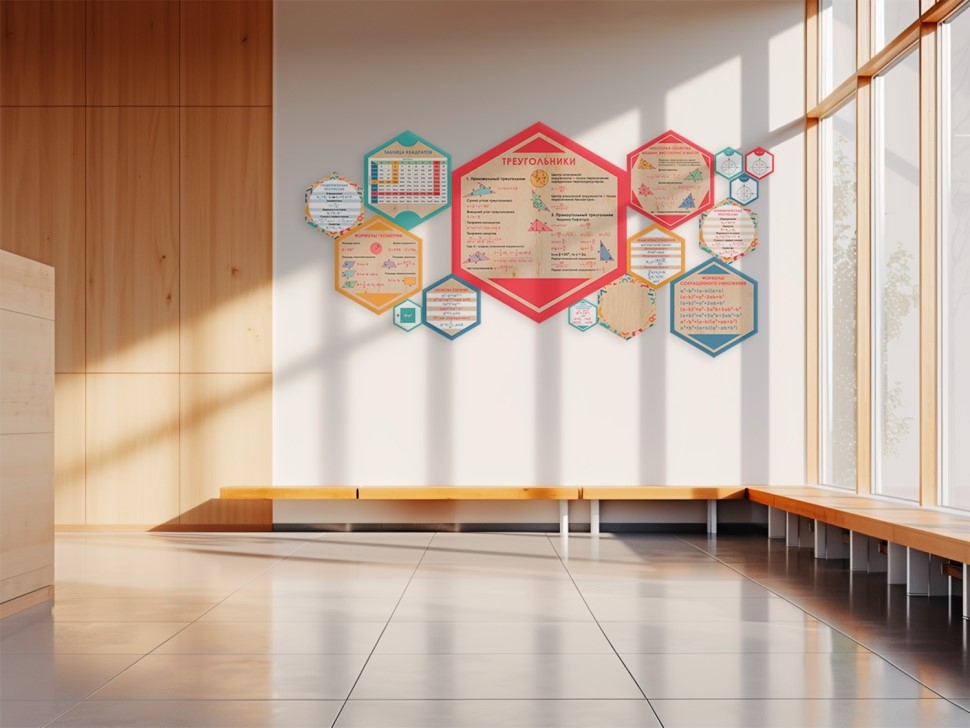 Описание и комплектация для прайсаОбразовательные панели для оформления стен школьных учреждений. Выполняют две функции: декор и соответствующее предмету обучение. Комплект состоит из набора гексагонов различного размера, которые можно комбинировать, исходя из вашего желания и конфигураци