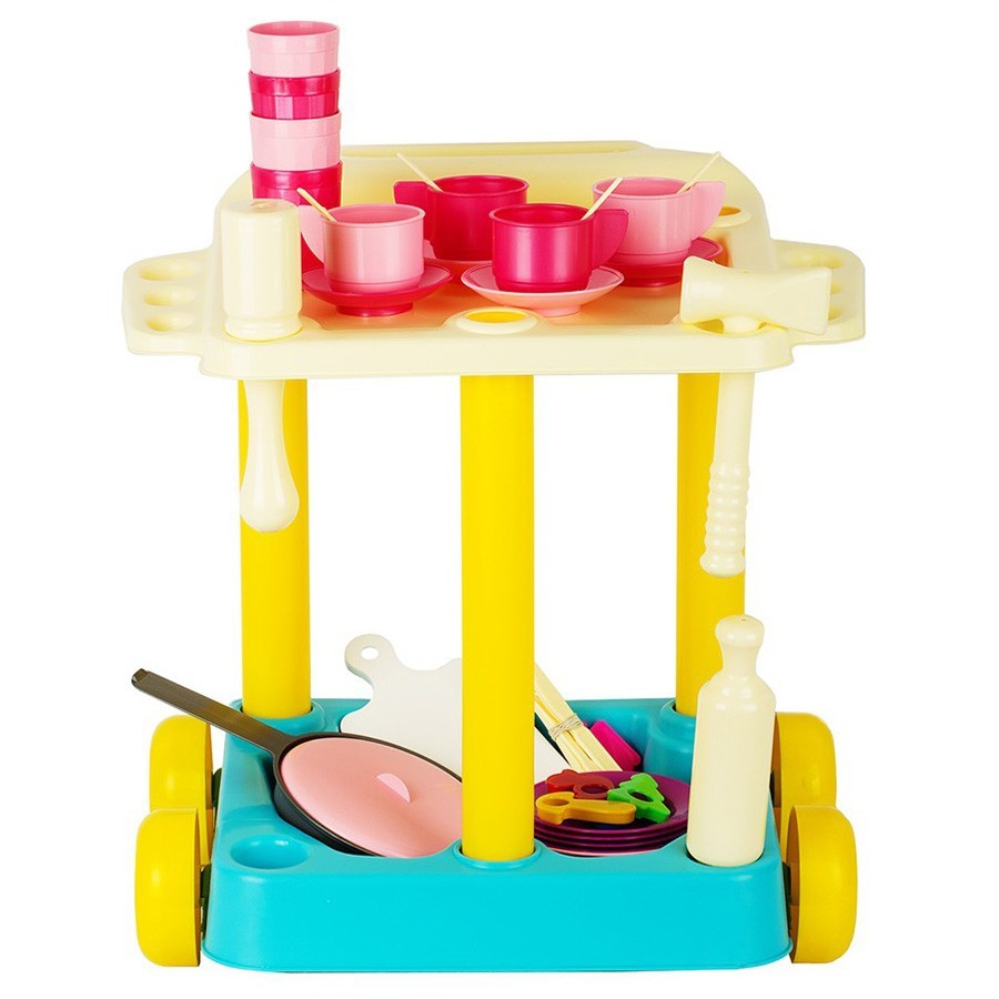 Сервировочный столик с большим набором посуды подойдет для различных сюжетно-ролевых игр, например в "кухню" или "чаепитие". В комлпект входит сам столик на колесиках и различная посуда - тарелки, чашки, сковорода с крышкой, толкушка, столовые приборы и другие предметы, которые могут пригодиться при приготовлении пищи и сервировке стола. Посуда изготовлена из качественного нетоксичного пластика приятных глазу цветов и очень похожа на настоящую, что придаст игре реалистичности. Игра с таким набором поможет детям изучить назначение различных приборов и посуды, познакомит с правилами поведения за столом, а также позволит весело провести время. Цвета представлены в ассортименте.