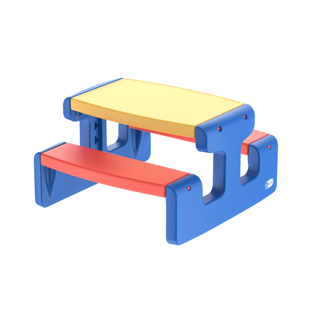 Стол со скамьей Titta обладает стойкостью к ударам, что делает его идеальным выбором для активных детей. Двусторонняя скамья позволяет детям сидеть лицом к лицу, способствуя общению и взаимодействию. Легко моется и устойчив к воде, что делает его уход простым в уходе и позволяет использовать на улице.