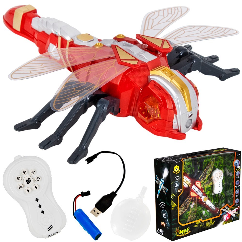 Комплектация: стрекоза – 1 шт., пульт управления (6,5 х 12 см) – 1 шт., USB зарядка – 1 шт., батарея 3.7 V – 1 шт., флакон для воды – 1 шт.
