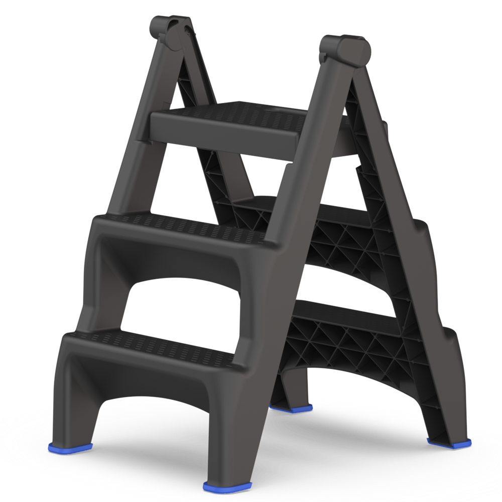 Продукт исполнен из усиленного полипропилена. Крепкая и долговечная конструкция предназначена для усилия до 150 кг. Широкие ступени глубиной 110 мм, а так же верхняя ступень 200 мм делают подъем комфортным. Специальный узор на ступенях предотвращает скольжение стопы, делает подъем и спуск безопасным. Опоры из прочного нескользящего пластика обеспечивают устойчивое положение. Ступени с двух сторон позволяют работать не переставляя стремянку, тем самым экономя время.
