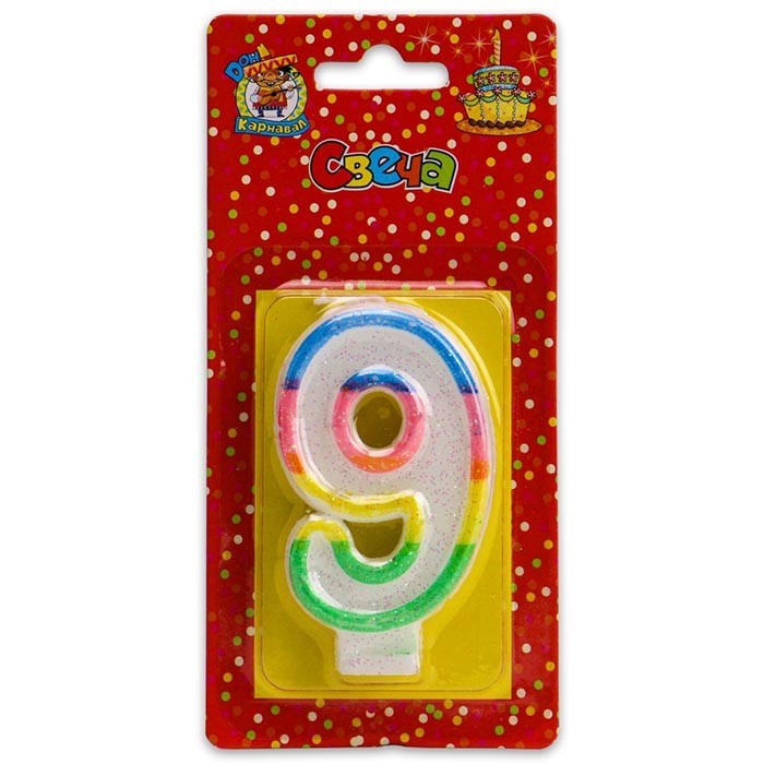Свеча цифра "9" с разноцветной окантовкой с блестками С-2424