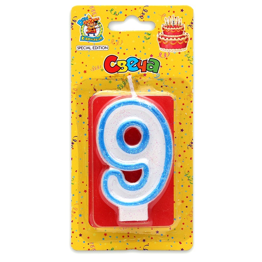 Свеча цифра "9" с синей окантовкой с блестками С-1777