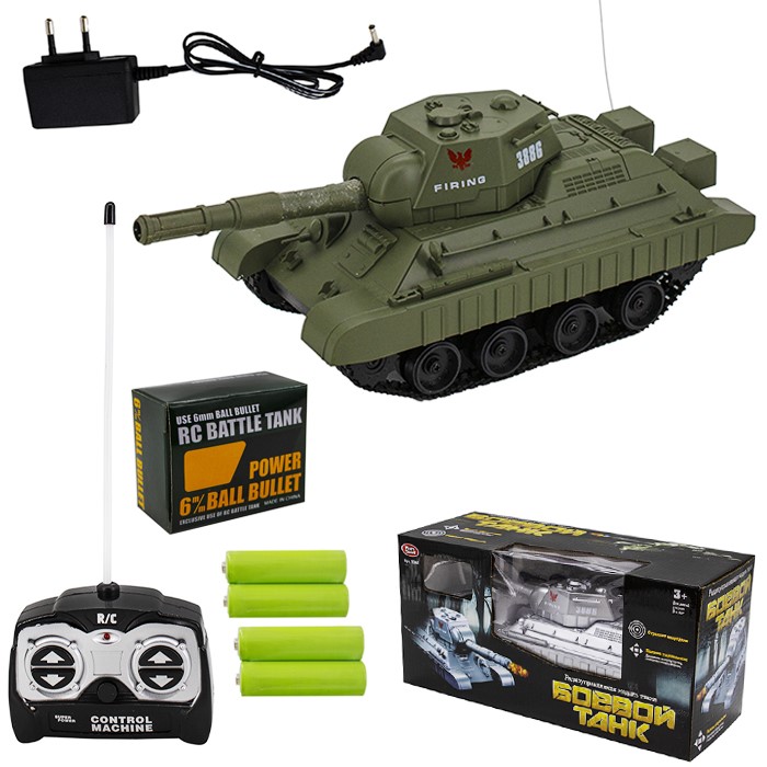 Комплектация: танк, пульт управления, аккумулятор, зарядное устройство, пульки