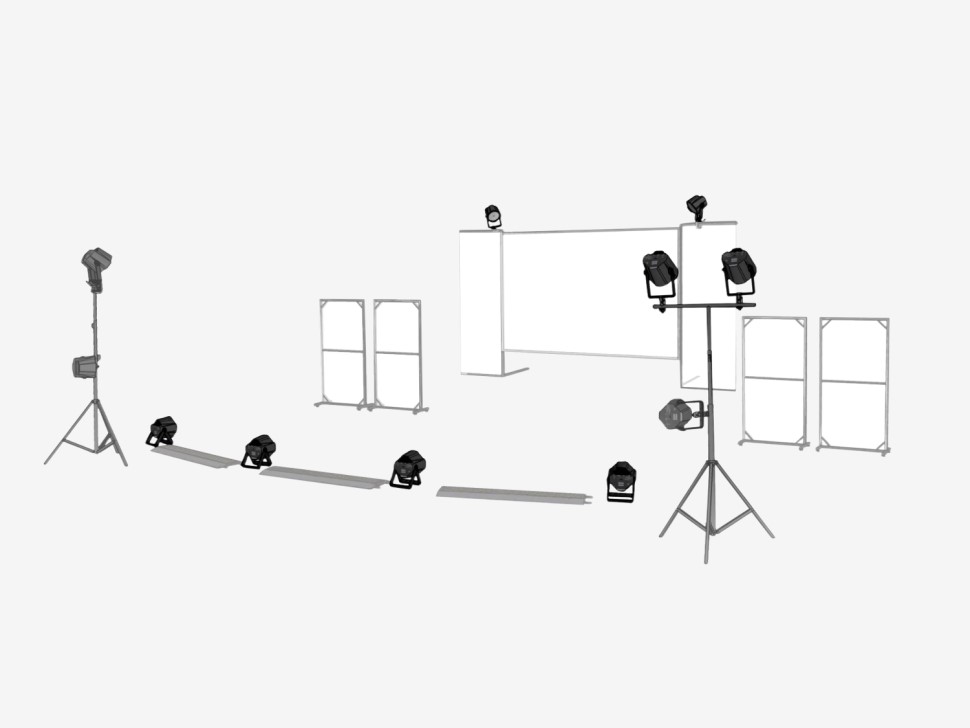 Конструкция сцены.Световое оборудование: 12 прожекторов DMX со светофильтрами, штативы для осветительных приборов.