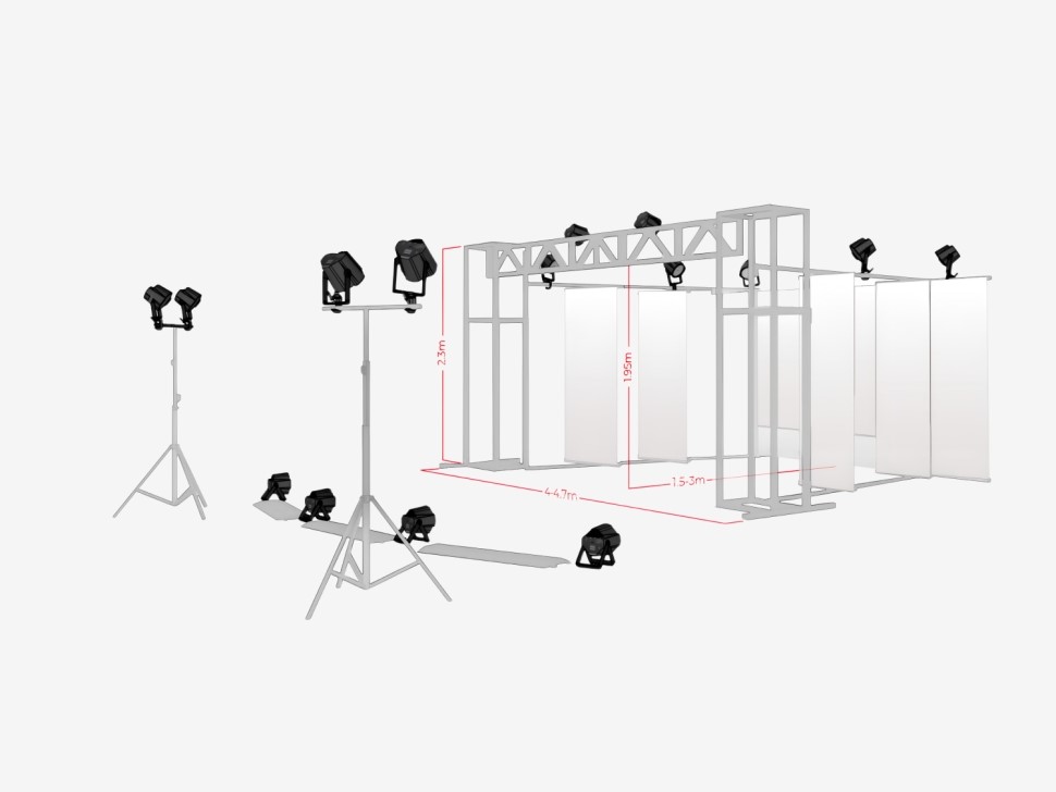 Световое оборудование: 16 прожекторов DMX со светофильтрами, штативы для осветительных приборов.