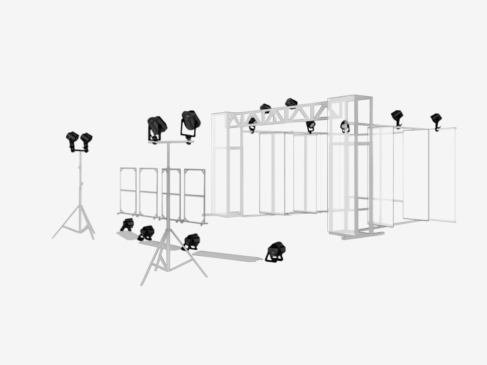 Световое оборудование: 20 прожекторов DMX со светофильтрами, штативы для осветительных приборов.
