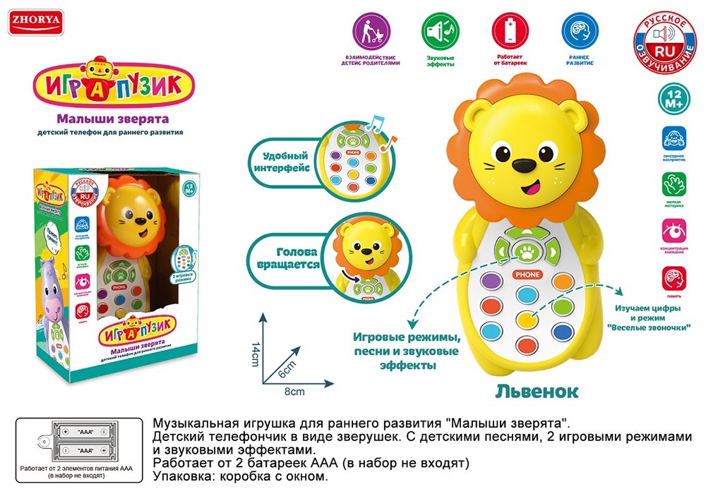 Телефон ZYA-A3220-2 Играпузик Львенок на батарейках, русск. озвуч., в кор.