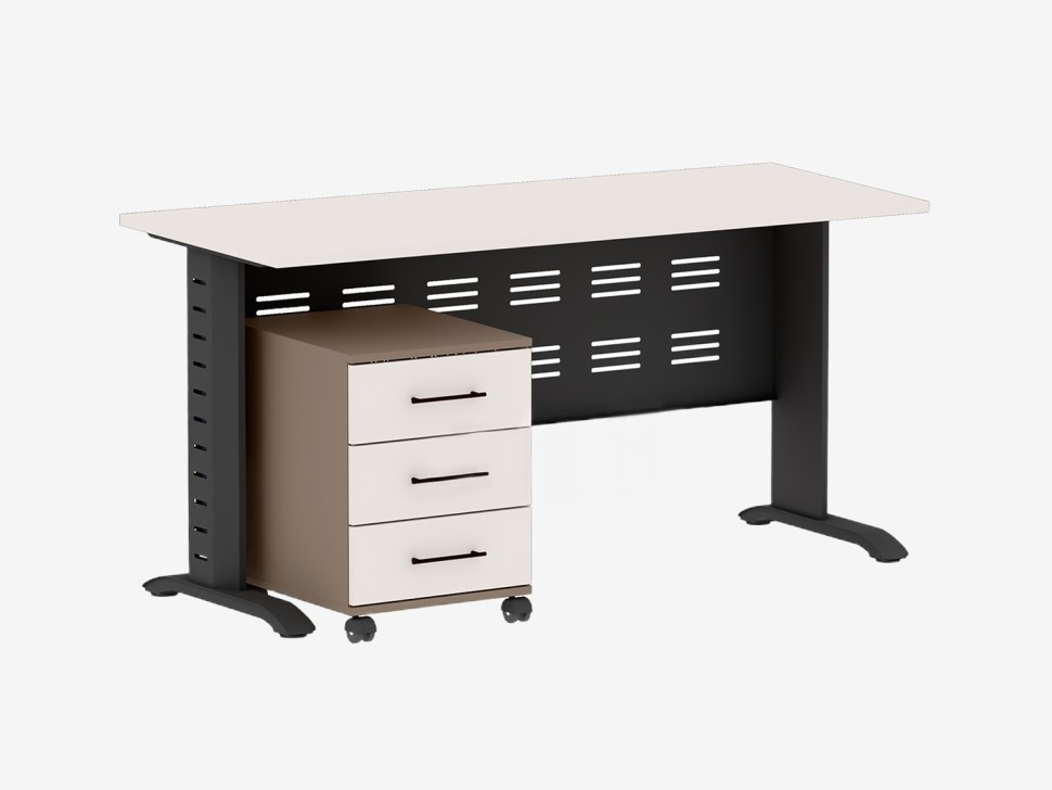 Рабочее место преподавателя — это рабочий письменный стол и подкатная тумба. Столешница письменного стола изготовлена из ЛДСП толщиной 22 мм. Между боковыми опорами для увеличения жесткости металлокаркаса установлен декоративный экран. Все элементы металлокаркаса покрыты порошковой краской.