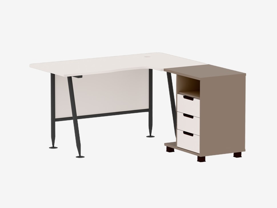 Угловой стол для преподавателя на металлическом каркасе с приставной тумбой. Столешница изготовлена из ЛДСП толщиной 22 мм с кромкой в цвет. Ножки стола расположены под углом для устойчивого положения. Каркас изготовлен из трубы плоскоовального сечения, покрытый износостойкой порошковой краской.