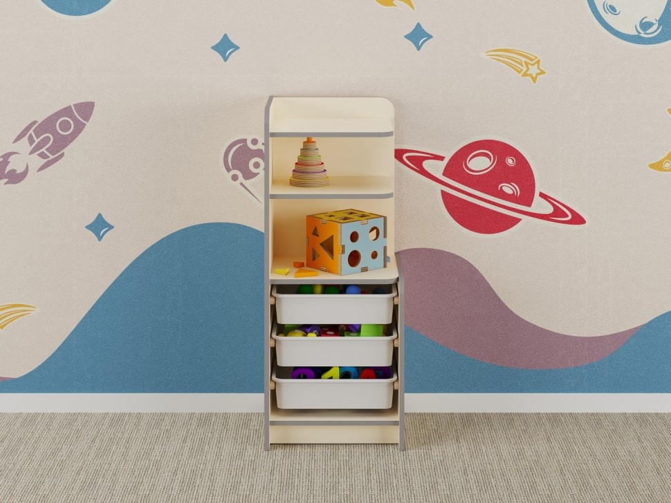 Верхняя часть шкафа оснащена двумя открытыми секциями, удобными для хранения книг, коробок с пазлами и детских поделок. В нижней части расположены три выкатных пластиковых ящика, которые идеально подходят для конструктора, мелких игрушек и дидактических материалов. Ящики легкие, прочные и полностью вынимаются, что делает уборку и дезинфекцию максимально удобной.