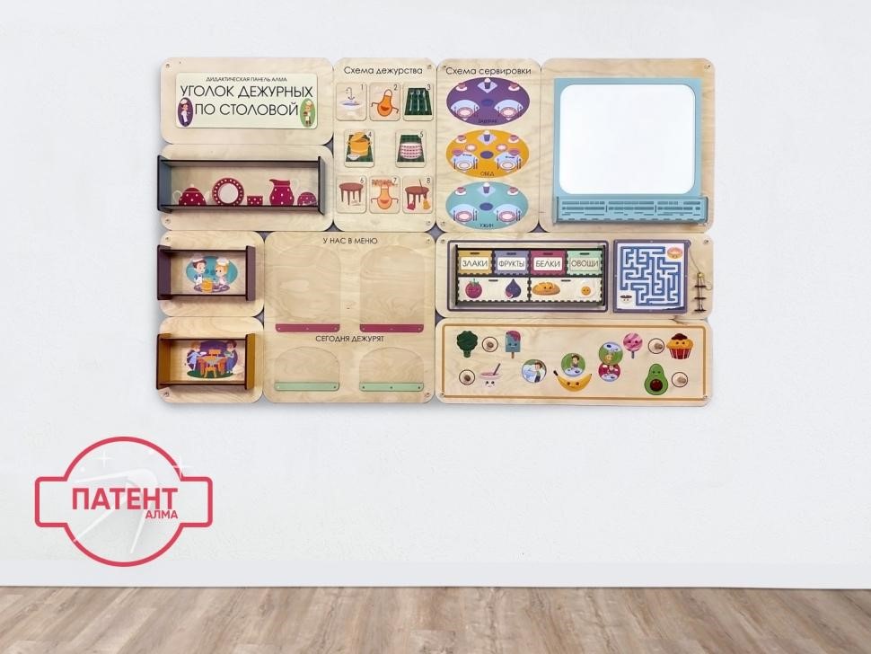 Занятия с панелью «Уголок дежурных по столовой» нацелены познакомить детей с меню питания, графиком дежурств, полезными продуктами, правильным поведением за столом. Дети приобщаются к посильной работе, учатся заботиться о коллективе.Креативно оформляют помещение и скрывают дефекты и неровности стен. Вы можете разместить их в группах, в межэтажном пространстве, в коридоре или зоне отдыха. Комбинируйте модули по своему желанию и размерам стен, а если осталось пустое место – закройте дополнительными декоративными блоками.