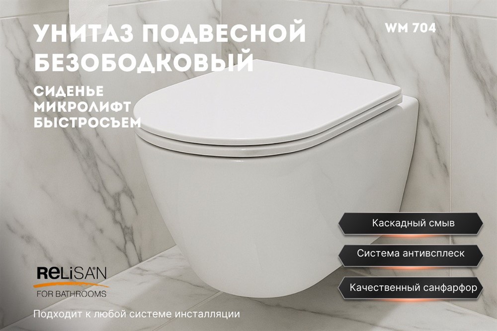 Закажите подвесной безободковый унитаз Relisan с сиденьем микролифт из дюропласта — создайте современное пространство с европейским качеством. Доставка по всей России.