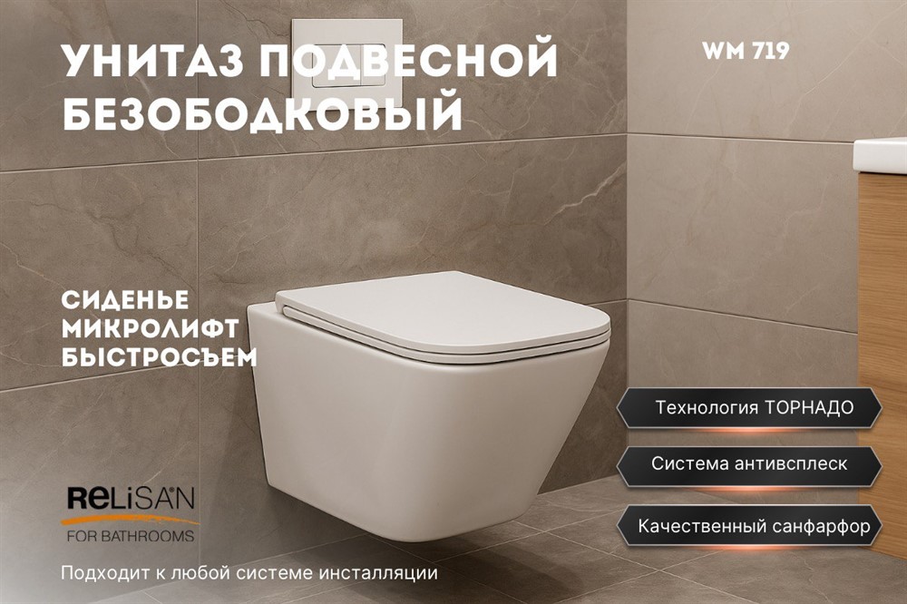 Закажите подвесной безободковый унитаз Relisan с сиденьем микролифт из дюропласта — создайте современное пространство с европейским качеством. Доставка по всей России.