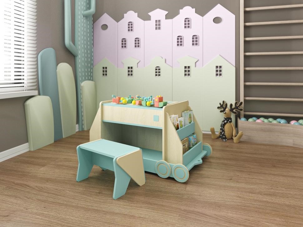 Вагон-конструктор. Сверху у него есть большой отсек для конструктора. Это может быть Lego или мягкий магнитный конструктор «Макки», так любимый юными изобретателями! При надобности отсек закрывается съёмной крышкой с двумя удобными ручками. В комплекте имеет лавочку, задвигаемую в отведённое ей углубление в нижней части. По бокам вагона – полки для книг или игрушек.