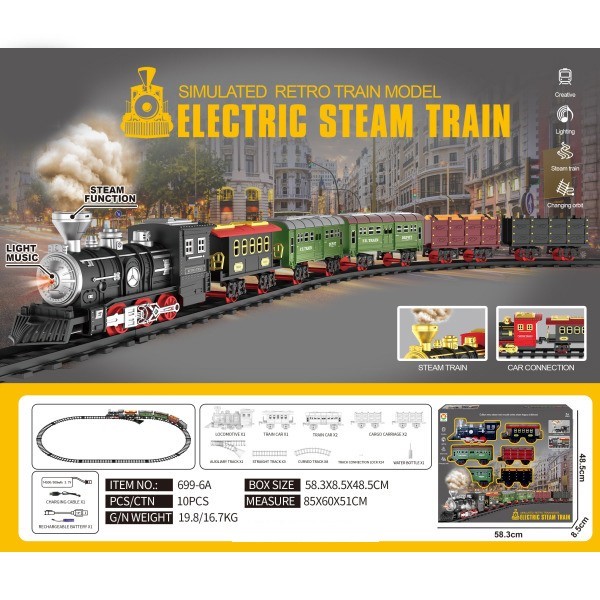 Комплектация: фрагменты железной дороги, вагоны, аккумулятор, бутылочка, кабель для зарядки