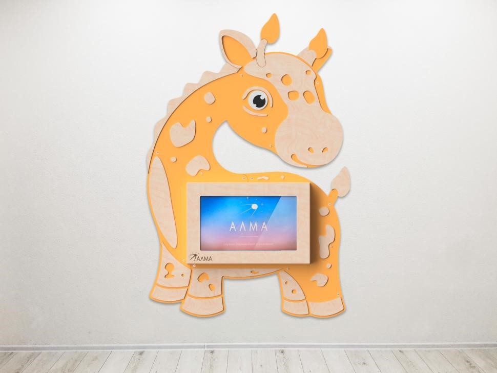 Настенная панель «Жираф» со встроенной интерактивной сенсорной панелью 32 дюйма. Это одновременно декоративное оформление стен и развивающая игрушка, ведь на панели установлен пакет игрового и обучающего ПО от АЛМА.